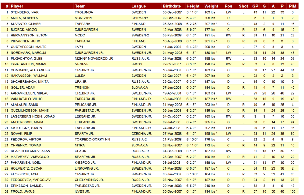- Ruotsalaisen juniorimyllyn tuorein kultakimpale on Ivar Stenberg. Stenberg on joissain arvioissa haastanut McKennaa tosissaan draftin ykköspaikasta. Stenberg pelasi historiallisen kovan kauden Ruotsin pääsarjassa (SHL) ollen tehokkain alle 19-vuotias pelaaja pitkään aikaan. Stenberg on kokonaisvaltaisempi pelaaja kuin McKenna ja loisti erityisesti nuorten MM-kisoissa johdattaen Ruotsin kultaan.